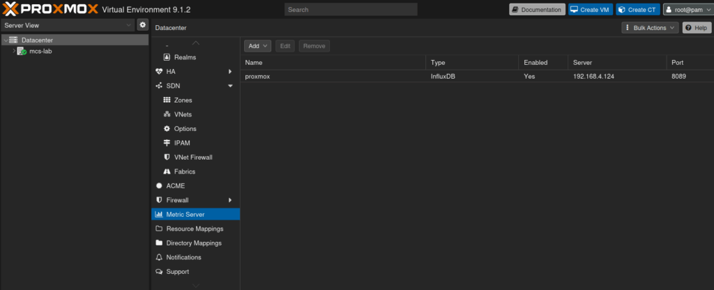 wir gehen zu „Daatacenter“ –> „Metric Server“ –> „ADD“ –> „INFLUXDB“