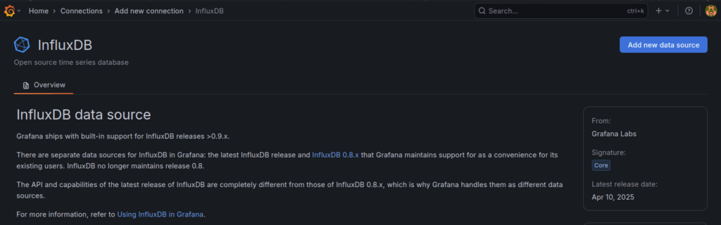 Wir gehen zu „HOME –> Connection –> Add new Connection –> Influxdb“ und drücken oben rechts auf „ADD NEW DATASOURCE“