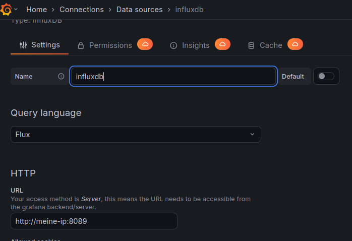 wir wählen „FLUX“ und geben unsere IP:PORT von Influxdb ein.